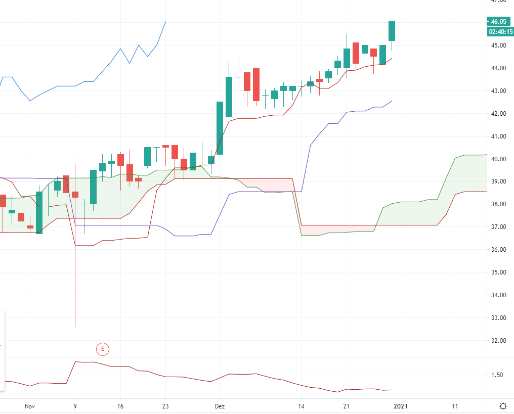 Trendy Geschrieben 30. Dezember 2020 Autor Teilen Geschrieben 30. Dezember 2020 Hallo Zusammen, ich wünsche ein schönes Weihnachtsfest gehabt zu haben und ihr habt hoffentlich das machen können, worauf ihr Lust hattet. Ab dem neuen Jahr werden meine geposteten Charts jetzt wie unten aussehen. Nicht erschrecken, da ist für andere Systeme der Ichimoku Kinko Hyo mit drin. Den benötige ich für die Trendstärke für andere Systeme. Bin jetzt mit EU auf Tradingview umgestiegen. Da es die kostenfreie Version ist, kann ich nur eine Watchlist anlegen. Zitieren Link zu diesem Kommentar Auf anderen Seiten teilen Mehr Sharing-Optionen...