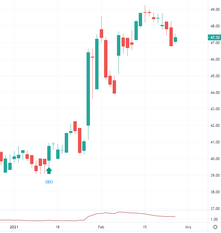 Trendy Geschrieben 22. Februar 2021 Teilen Geschrieben 22. Februar 2021 In Anlehnung an ein Zitat vom Terminator, auch wenn ich mich nicht mit ihm vergleichen kann und will: I am back. Ich brauchte mal eine Auszeit nach der langen Doppelbelastung von Vollzeitjob und Börse. Auch weil es seit KW03 nicht so läuft, wie man es für eine Motivation benötigt. Da ich heute Kurzarbeit habe, bin ich früh mal durch meine Liste gehetzt und habe doch folgende Signale gefunden: Bilfinger: SB: 30,34; SL: 29,47 (hatte den Trade schon mal vor Börseneröffnung mit einem SL 29,78 drin, habe ihn aber aufgrund der schlechte Anfangsphase wieder geext. Nach der Erholung habe ich den Traden mit diesen Werten neu eingestellt;; Risiko: 0,87 TP: 33,18; geplanter Gewinn: 2,84; CRV: 3,26,; nächster Termin: 11.05.21; Tages- und Wochenchart aufwärts, Monatschart abwärts Shop Apotheke: SB: 226,65; SL: 217,89; Risiko: 8,76 TP: 247,95; geplanter Gewinn: 33,18; CRV: 2,43; nächster Termin: 12.03.21; alle Zeitebenen aufwärts Beide Orders liegen im Markt und Bilfinger wurde gerade eingestoppt. Zitieren Link zu diesem Kommentar Auf anderen Seiten teilen Mehr Sharing-Optionen...